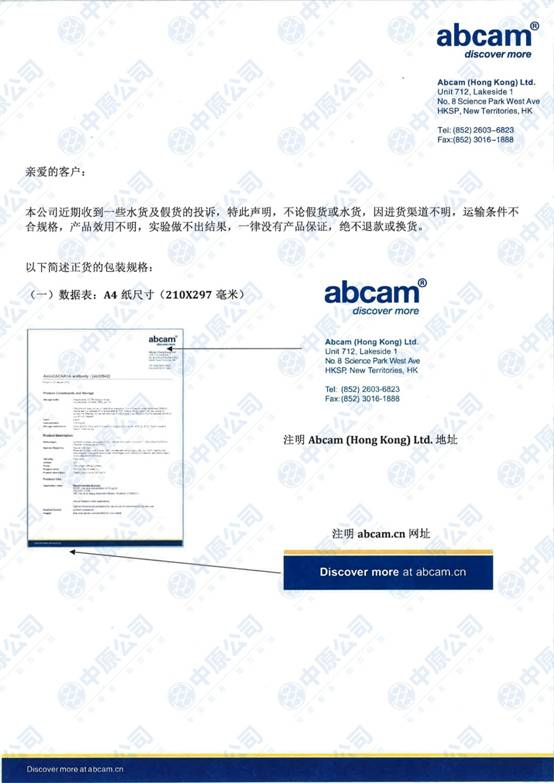 近期,Abcam公司收到一些水货及假货的投诉,这种产品,因进货渠道不明,运输条件不合规格,产品效用不明,从而导致一些实验做不出结果。在此,Abcam特此声明,这类产品一律没有产品保证,不退款或换货,请从正规渠道订购。2012-02-10 14:19:00.0