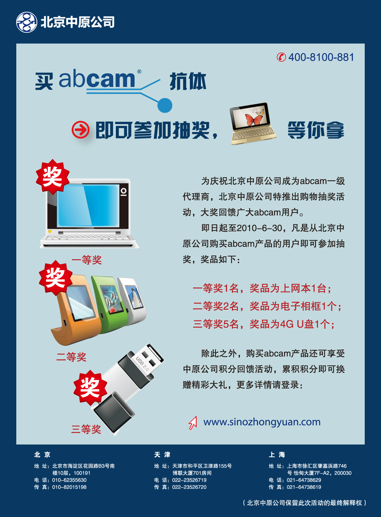 为庆祝北京中原公司成为abcam一级代理商,特推出购物抽奖活动回馈广大用户。 2010-08-13 11:07:00.0
