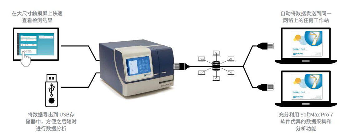 1. 通过直观的触摸式显示屏, 利用内置的 SoftMax 触摸软件, 可直观、轻松的设置实验步骤、运行实验、观看教程视频并控制用户访问。 2. 使用 NFC 功能可自动识别滤光片设置, 从而简化工作流程并避免错误发生。 3. 使用微孔读板机进行Western Blot检测。 4. 使用 QuickSync 将数据推送至任何电脑端, 无需从仪器中进行检索。 5. 使用四光栅加滤光片为基础的“杂合”光路系统, 可以选择更适合的方式获得较佳信号。 6. 注射器使用过程中利用 SmartInject™ 技术, 可确保试剂完全混合、且保证获得较佳检测信号。