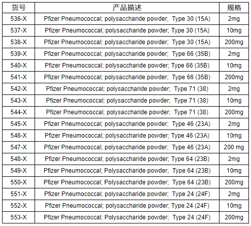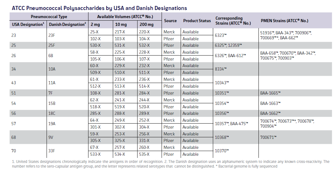 为了帮助分析和预防肺炎球菌病,ATCC可提供多种不同来源的肺炎球菌多糖。ATCC从Merck和Pfizer公司获得肺炎多糖(这些产品由Merck和Pfizer公司生产,抗原性也分别由其验证)。它们与目前市面上可买到的疫苗的血清型相同。每种多糖产品是被分别提取和纯化的,因此可作为特异性且有效的抗原用于以下研究:
