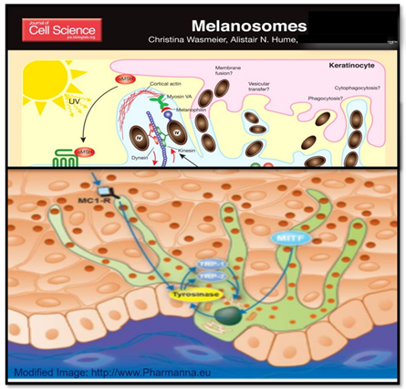 2、 皮肤色素沉着是一个多维度且复杂的过程;黑色素,在黑色素细胞中产生,在黑色素小体中包装,随后胞吐到细胞外,接着被相邻的角质细胞内吞。