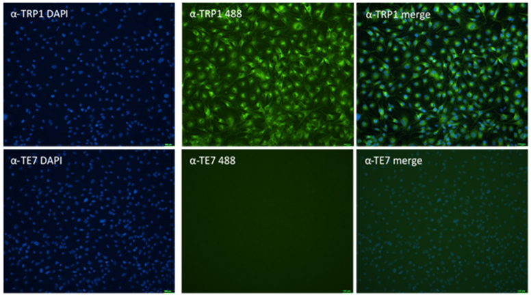 图1、永生化黑色素细胞均匀表达黑色素细胞特异性标记物TRP1,不表达成纤维细胞特异性标记物TE7。用4%多聚甲醛固定hTERT黑色素细胞,然后在PBS中用0.2%Triton x-100、0.1%吐温-20和10%正常山羊血清溶液做浸润封闭。然后细胞在含有0.05%吐温-20 和2%NGS的PBS溶液中,1:400小鼠抗人的一抗中进行染色。之后对细胞进行洗涤,然后以1:400稀释的Alexa fluor 488结合的山羊抗鼠二抗IgG进行染色。最后细胞用PBS稀释的1:5000 Hoechst核染色进行复染,并用尼康Ti-eclipse成像倒置显微镜和20x物镜进行观察。(比例尺为100微米)