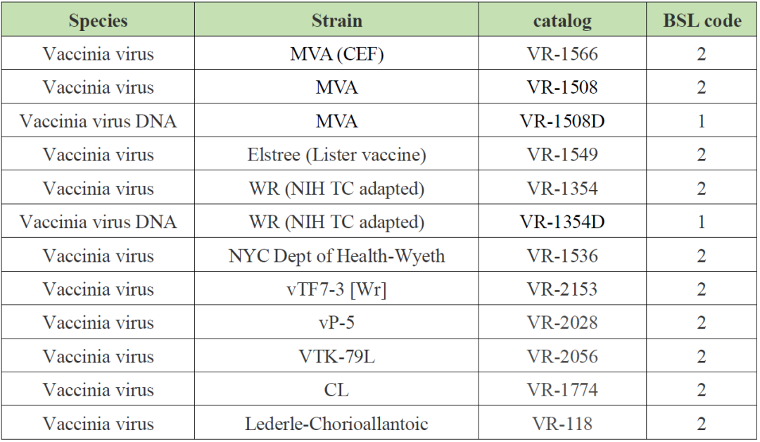 随着猴痘病毒重新出现在公众视线中,猴痘相关的各种研究材料也成为急需产品。ATCC作为全球范围的生物资源收藏中心,收藏有与猴痘病毒研究相关的一些资源,我们做了如下整理。受美国出口管理条例管控ATCC无法出口猴痘病毒,与其同为正痘病毒属的痘苗病毒可以作为疾病鉴别诊断和研究疫苗等的基础材料。