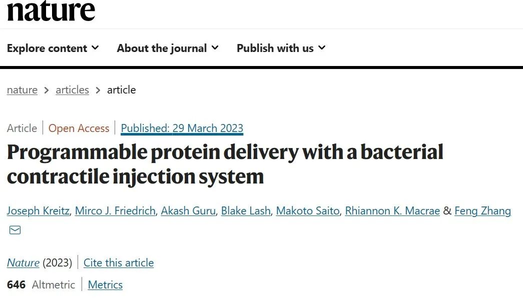 2023年3月底,CRISPR的先驱者,华人科学家张锋教授及其团队在 Nature 期刊发表了题为:Programmable protein delivery with a bacterial contractile injection system 的研究论文。