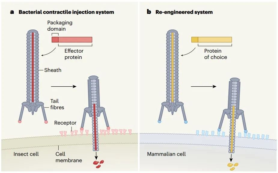 重新设计细菌的胞外可收缩注射系统,将其改造为专门靶向特定人类细胞递送所需蛋白质的装置